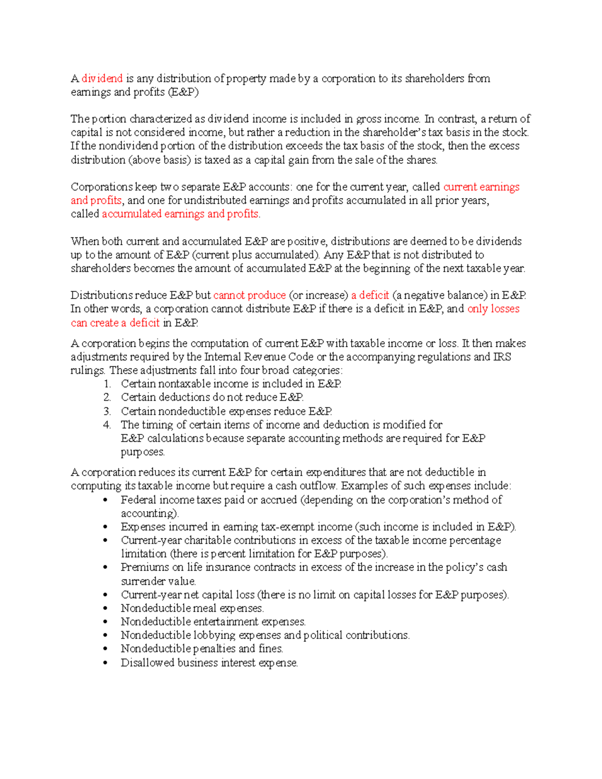 Chapter 7 Current Earnings And Accumulated Earnings A Dividend Is Any Distribution Of Property Studocu
